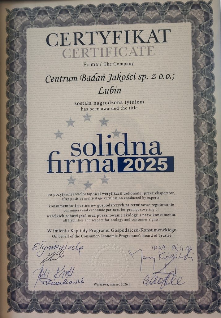 Centrum Badań Jakości sp. z o.o. z Certyfikatem „Solidna Firma” 🏆
